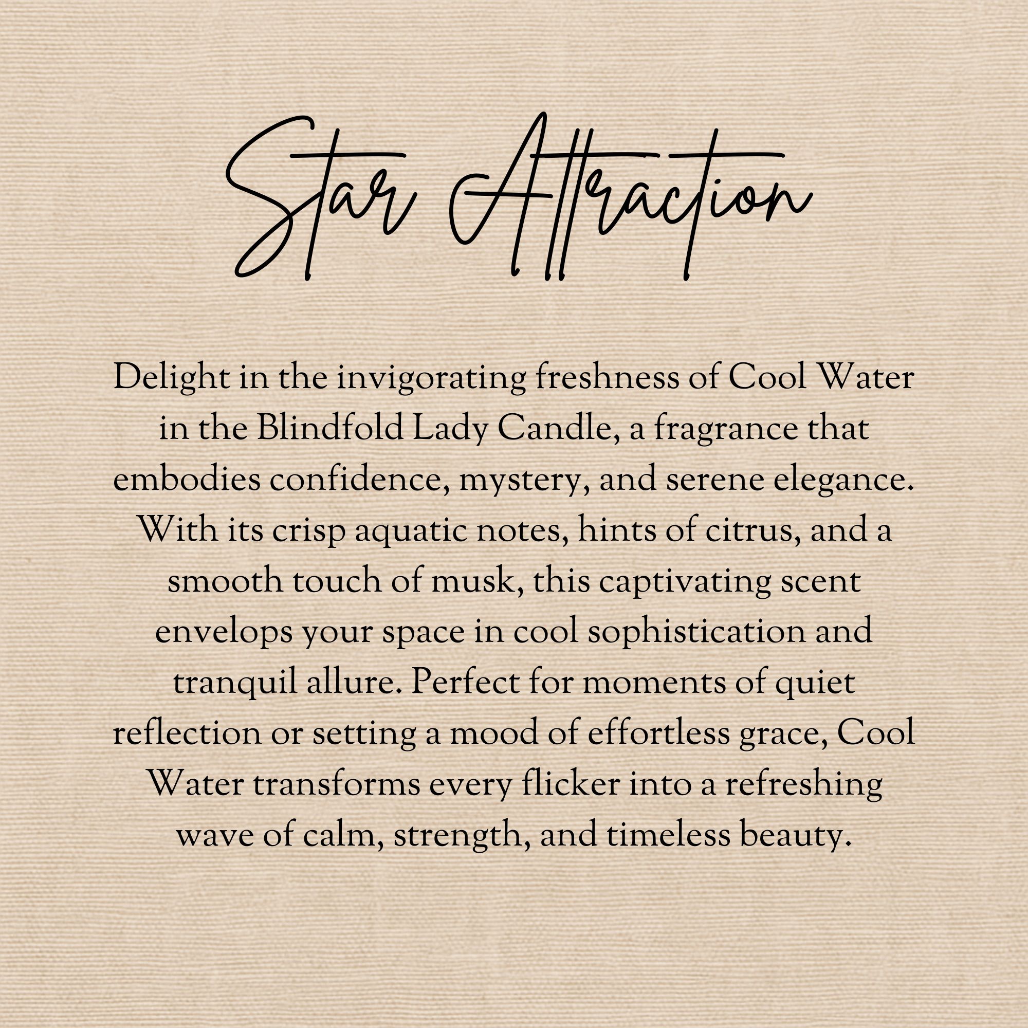 Infused with the fresh, aquatic fragrance of Cool Water, it evokes the soothing calm of ocean waves — clean, crisp, and rejuvenating. With a burn time of up to 12 hours, The Blindfold Lady Candle combines contemporary artistry with tranquil scent, perfect for gifting or elevating your interior style.